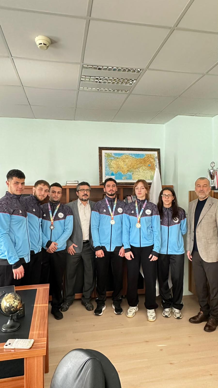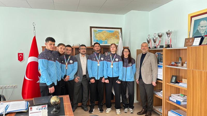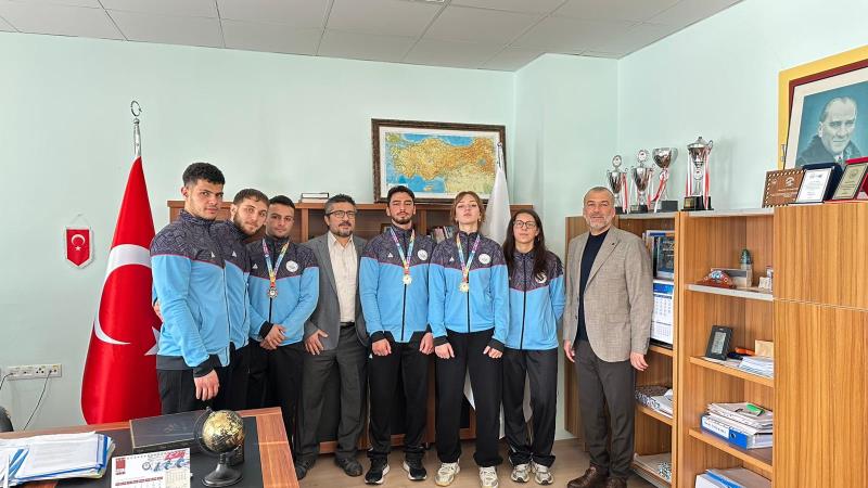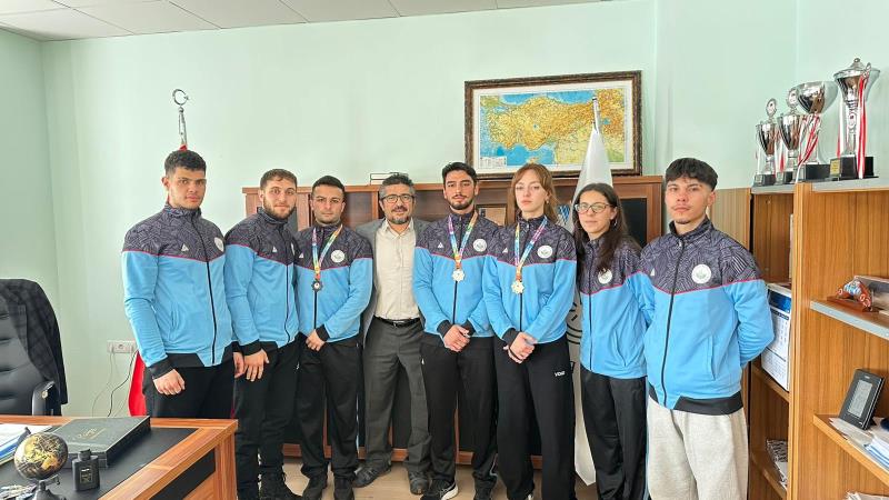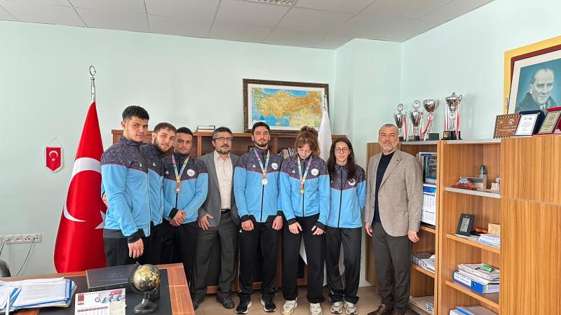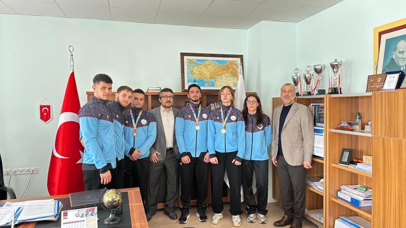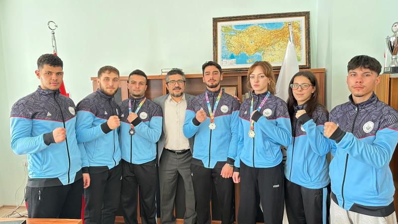 Burdur’da düzenlenen Üniversitelerarası Türkiye Kick Boks Şampiyonası sonrası dereceye giren 65 kg Point Fighting kategorisinde Türkiye Şampiyonu Zeynep Aysu Kankoç, 74 kg Kick Light kategorisinde Türkiye İkincisi Kubilay Karadeniz, 67 kg Full Contact kategorisinde Türkiye Üçüncüsü Mustafa Özkan ve antrenör Prof. Dr. Hanifi Üzüm, Spor Bilimleri Fakültesi Dekanı Prof. Dr. Ümid Karlı’yı ziyaret etti. Başarılarından dolayı sporcuları tek tek tebrik eden Dekan Karlı, sporun ve sporcunun her zaman yanında olduklarını vurgulayarak; "Üniversitemizin adını ulusal düzeyde başarıyla temsil eden gençlerimizle gurur duyuyoruz," ifadelerini kullandı. oldukça samimi bir ortamda geçen sohbet sonrası dekanımız şampiyonlarla fotoğraf çektirmeyi ihmal etmedi.