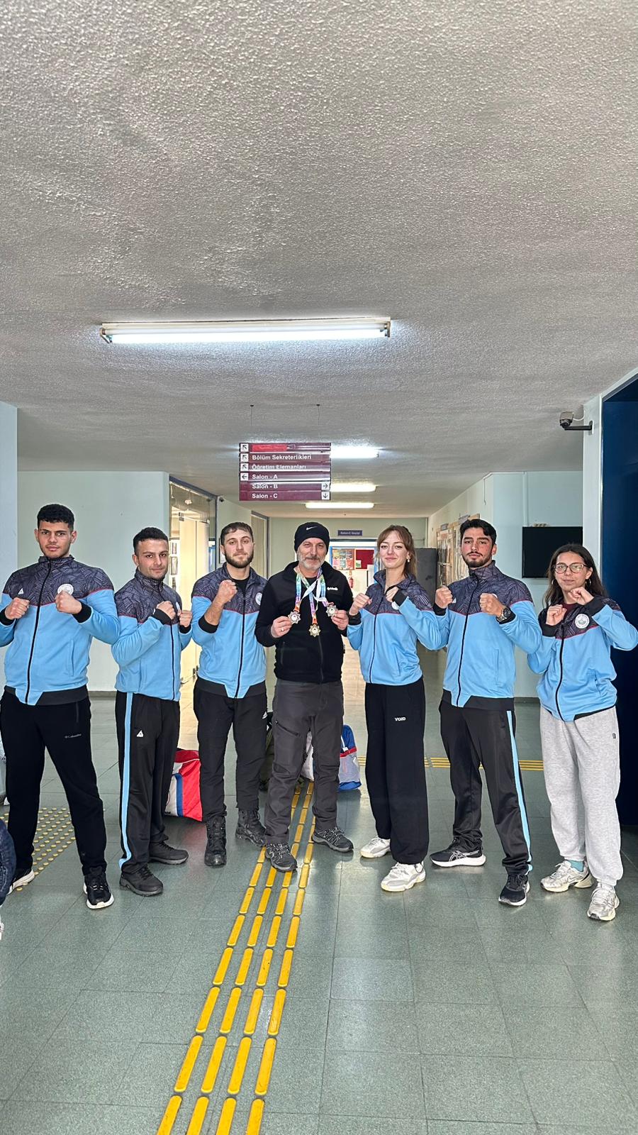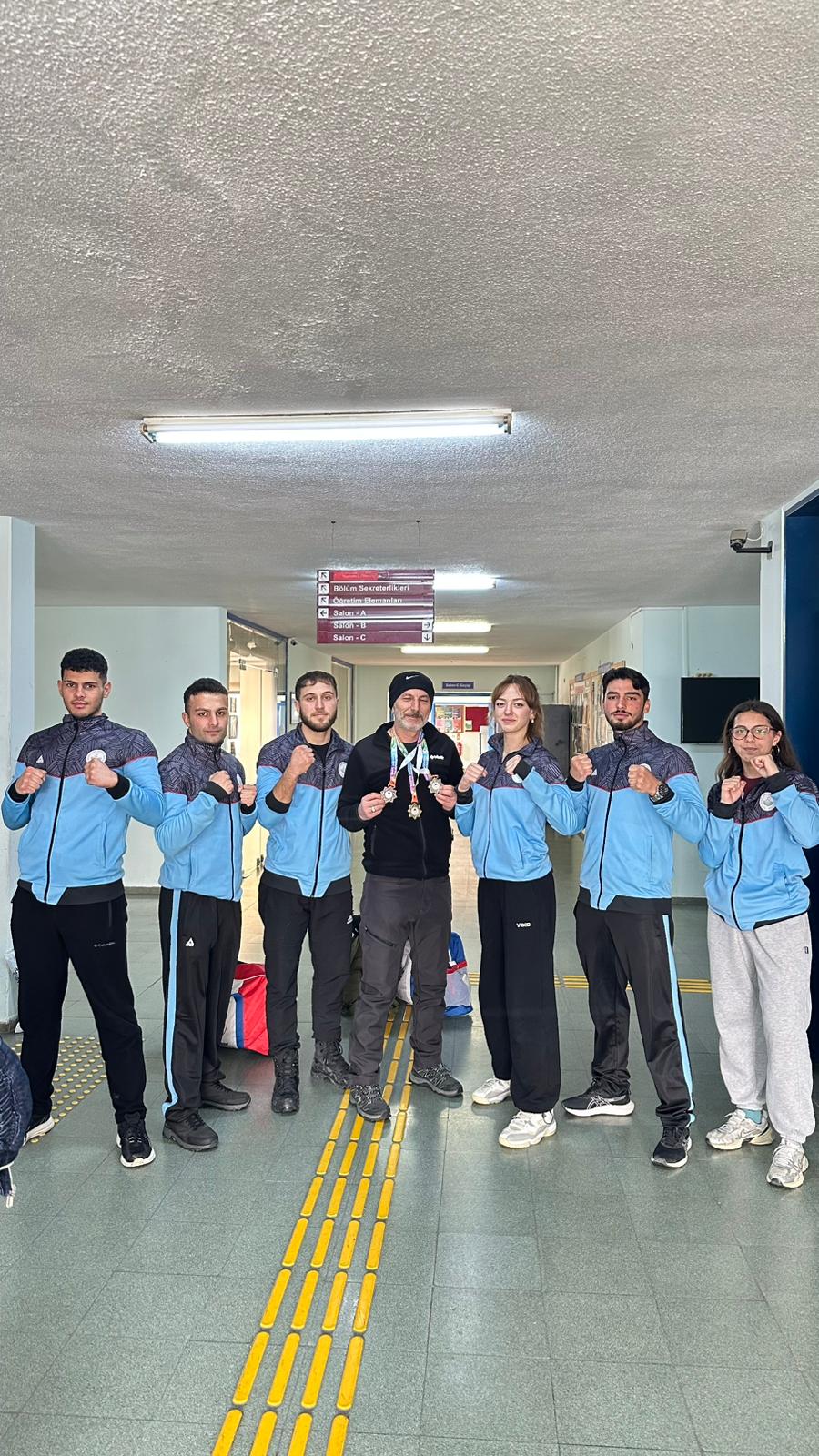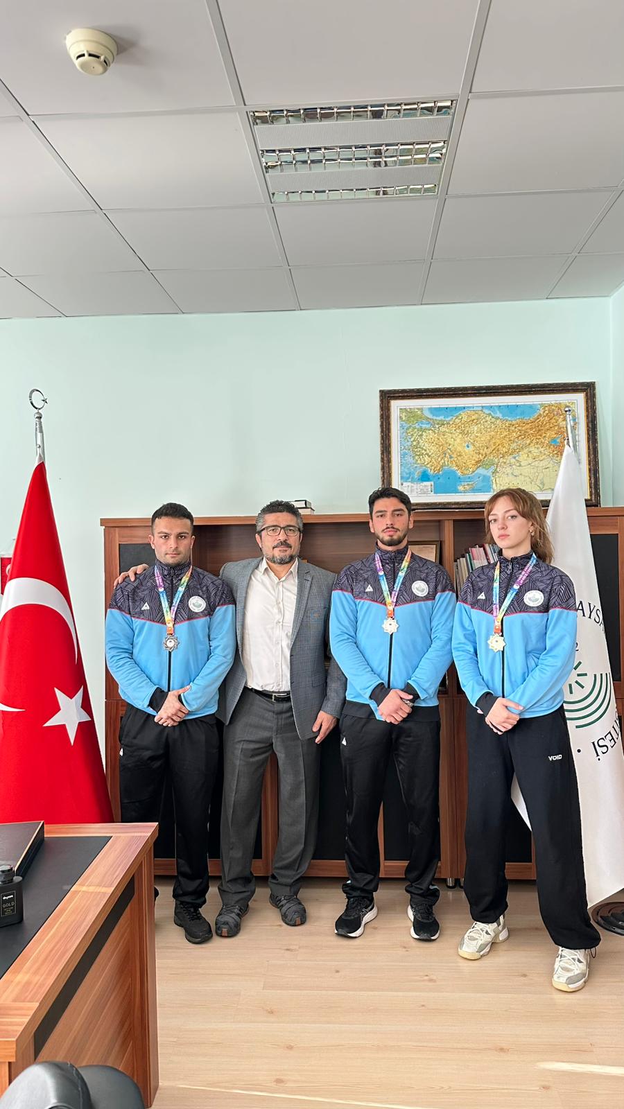 Burdur’da düzenlenen Üniversitelerarası Türkiye Kick Boks Şampiyonası sonrası dereceye giren 65 kg Point Fighting kategorisinde Türkiye Şampiyonu Zeynep Aysu Kankoç, 74 kg Kick Light kategorisinde Türkiye İkincisi Kubilay Karadeniz, 67 kg Full Contact kategorisinde Türkiye Üçüncüsü Mustafa Özkan ve antrenör Prof. Dr. Hanifi Üzüm, Spor Bilimleri Fakültesi Dekanı Prof. Dr. Ümid Karlı’yı ziyaret etti. Başarılarından dolayı sporcuları tek tek tebrik eden Dekan Karlı, sporun ve sporcunun her zaman yanında olduklarını vurgulayarak; "Üniversitemizin adını ulusal düzeyde başarıyla temsil eden gençlerimizle gurur duyuyoruz," ifadelerini kullandı. oldukça samimi bir ortamda geçen sohbet sonrası dekanımız şampiyonlarla fotoğraf çektirmeyi ihmal etmedi.